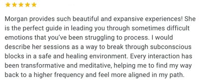“I went into the session with an open mind and without expectation. My intention was to be present in the moment for myself. By the end of the session, I was energized and relaxed at the same time. I felt clarity and peace with my current state. During the session, my eyes, lips, arms, hands, and legs were filled with sensation that allowed me to remain centered and grounded during the experience. I was relieved from internal stress and chaos. Morgan was an excellent guide for SBW. She fostered a safe environment to express released emotions and feelings. Her guidance and voice were soothing and meditative. Her instruction and transitions during the session were clear and thoughtfully timed. This was an exceptional first time experience for me and I will be trying a 1:1 session with Morgan in the future!”